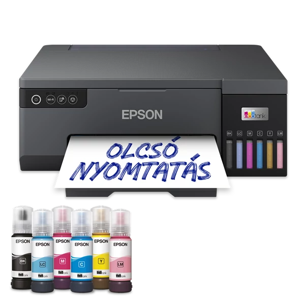 | Nincs szükség többé tintapatronokra Az integrált, frontoldali tintatartályrendszer költséghatékony fotónyomtatást biztosít. A nagy kapacitású, 70 ml-es tintapalackokkal működő tintatartály akár 2100 minőségi, 10x15 cm-es színes fotó nyomtatására is képes, egy komplett tintapalack-készlettel1. A színenként cserélhető tintapalackokkal az újratöltés gyors és egyszerű a kulcszáras megoldásnak és a cseppmentes fúvókáknak köszönhetően. Csak gazdaságosan Mindig spórolni fog, amikor ezzel az EcoTank nyomtatóval nyomtat, ráadásul a fotónkénti költség is rendkívül alacsony. A hő nélküli Micro Piezo nyomtatófej-technológiának köszönhetően az EcoTank nyomtató energiafogyasztása kedvező, így az energiaszámlán is megtakaríthat. A nyomtató nagy tintatartályokkal rendelkezik, amelyeket kedvező áron kapható tintapalackokkal tölthet fel. Kompakt kialakítása révén az L8050 a legtöbb helyen könnyedén elfér. Egyszerűen használható és megbízható A modell ideális, ha jó minőségű fényképeket szeretne nyomtatni nagy mennyiségben, alacsony fotóköltség mellett. Az L8050 megbízható vezeték nélküli fotónyomtatást kínál, ráadásul PVC-azonosítókártyára és CD/DVD lemezre is nyomtathat. Kerülje el az állásidőt a könnyen hozzáférhető, cserélhető karbantartási készlettel és felszedő hengerrel. A normál 1 év vagy 50 000 oldalas garanciával2 az L8050 nyugalmat biztosít, így Önnek elég a nagyszerű fényképek készítésére koncentrálnia. Nyomtatás szinte bárhonnan Az L8050 használatával egyszerűen nyomtathat mobiltelefonról, táblagépről és laptopról. A Wi-Fi és Wi-Fi Direct szolgáltatással dokumentumokat küldhet okoseszközökről az Epson Smart Panel3 alkalmazás segítségével. |
